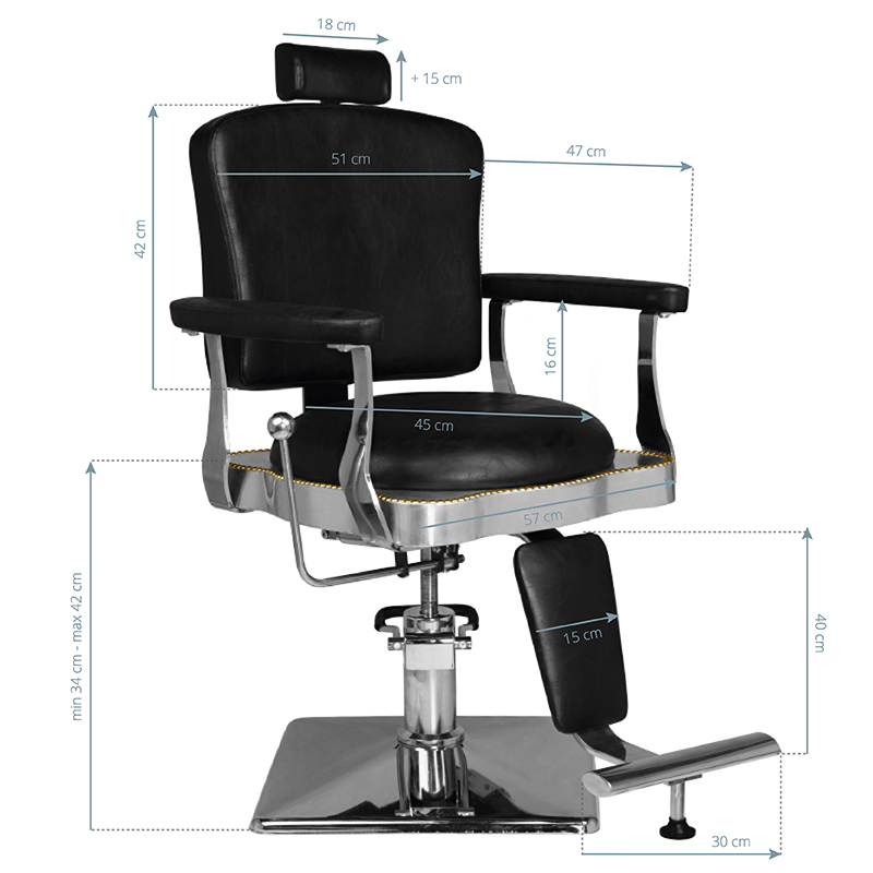 Klassieke barberstoel van Hair System. Elegant en zeer comfortabel. Een solide, chromen onderstel garandeert de stabiliteit van de zitting. Bekleding van hoogwaardig zwart eco-leer. De stoel heeft een verstelbare rugleuning met een hoofdsteun en in hoogte verstelbaar. De barberstoel wordt geleverd in delen voor zelfmontage.