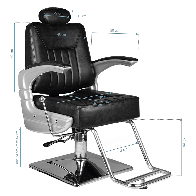 Klassieke barberstoel van Hair System. Elegant en zeer comfortabel. Een solide, chromen onderstel garandeert de stabiliteit van de zitting. Bekleding van hoogwaardig zwart eco-leer. De stoel heeft een verstelbare rugleuning met een hoofdsteun en in hoogte verstelbaar. De barberstoel wordt geleverd in delen voor zelfmontage.