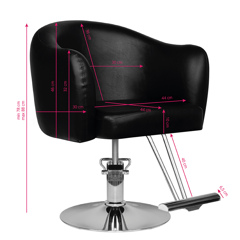 Moderne kappersstoel van Hair System. Elegant en zeer comfortabel. Een solide, chromen onderstel garandeert de stabiliteit van de zitting. Bekleding gemaakt van hoogwaardig zwart eco-leer. De stoel is op en neer verstelbaar.