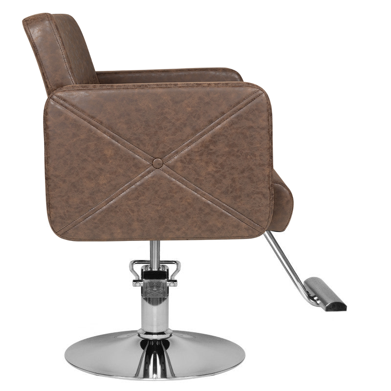 Stijlvolle kappersstoel van Hair System. Elegant en zeer comfortabel. Een solide, chromen onderstel garandeert de stabiliteit van de zitting. De bekleding is gemaakt van hoogwaardig bruin eco-leer. De stoel is op en neer verstelbaar.