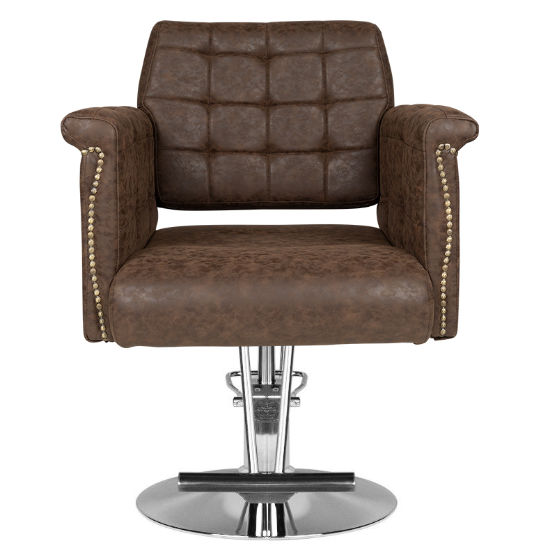 Stijlvolle kappersstoel van Hair System. Elegant en zeer comfortabel. Een solide, chromen onderstel garandeert de stabiliteit van de zitting. De bekleding is gemaakt van hoogwaardig bruin eco-leer. De stoel is op en neer verstelbaar.