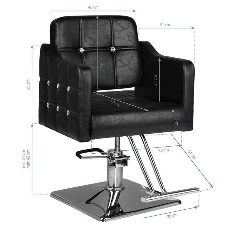 Moderne kappersstoel van Hair System. Elegant en zeer comfortabel. Een solide, chromen onderstel garandeert de stabiliteit van de zitting. Bekleding gemaakt van hoogwaardig zwart eco-leer. De stoel is op en neer verstelbaar.