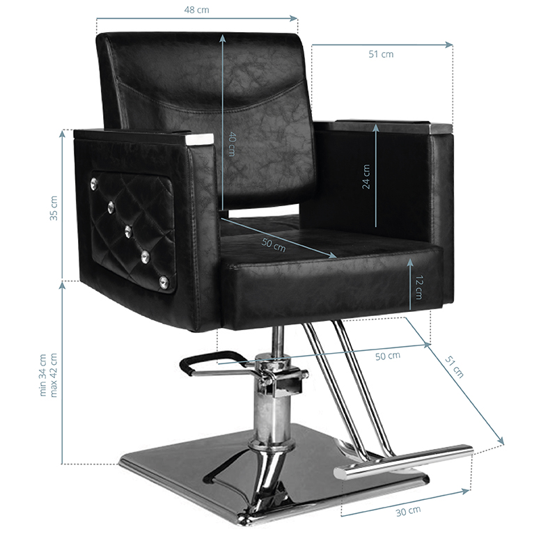Moderne kappersstoel van Hair System. Elegant en zeer comfortabel. Een solide, chromen onderstel garandeert de stabiliteit van de zitting. Bekleding gemaakt van hoogwaardig zwart eco-leer. De stoel is op en neer verstelbaar.