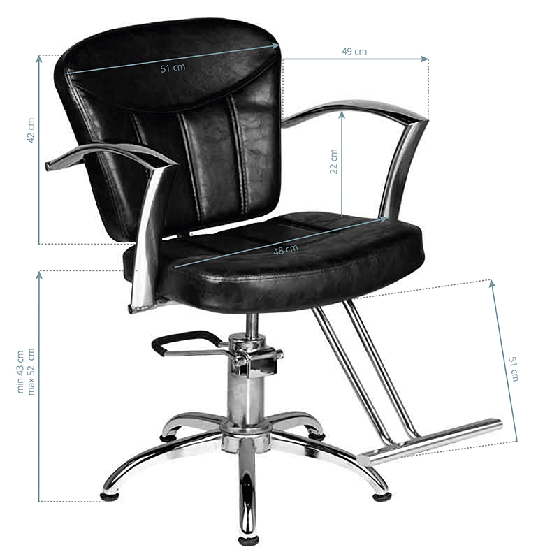 Moderne kappersstoel van Hair System. Elegant en zeer comfortabel. Een solide, chromen onderstel garandeert de stabiliteit van de zitting. Bekleding gemaakt van hoogwaardig zwart eco-leer. De stoel is op en neer verstelbaar.