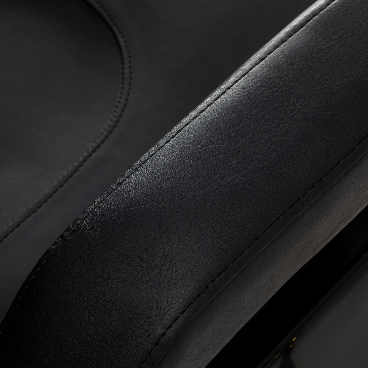 De stabiele ronde voet met gouden afwerking geeft de stoel een opvallende uitstraling en garandeert stabiliteit tijdens het werken. De zitting, rugleuning en voetensteun zijn gevuld met vormvast schuim en bekleed met zwart, aangenaam aanvoelend synthetisch leer voor duurzaamheid en hoog comfort. Het vochtbestendige en onderhoudsvriendelijke oppervlak maakt de stoel perfect voor dagelijks gebruik.
