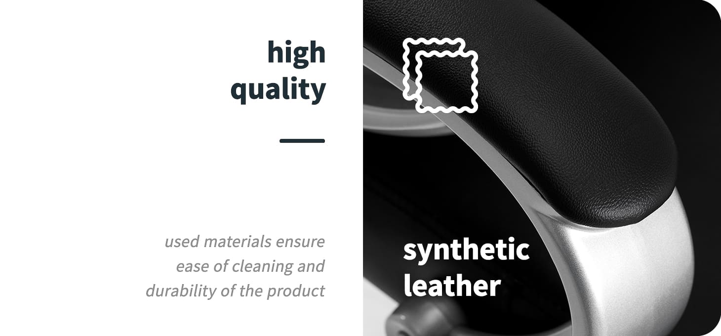 Vulling met duurzaam, vervormingsbestendig schuim en bekleding gemaakt van aangenaam aanvoelend synthetisch leer zorgt voor een lange levensduur van het meubilair en een comfortabel gebruik. Ze maken de apparatuur ook bestand tegen vocht, duurzaam en gemakkelijk schoon te maken. Kaft in zwarttinten met decoratieve elementen geven het een uniek karakter. De uitrusting onderscheidt zich door een modernistisch design, waardoor de kappersstoel prachtig tot zijn recht komt in woonkamers die in een moderne stijl zijn ingericht.