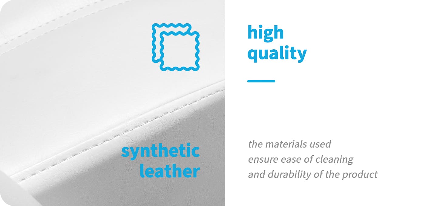 De stoel is bij uitstek geschikt tot podotherapeutische behandelingen – de gedeelde voetsteun vergemakkelijkt de comfortabele uitvoering van diensten, waardoor onafhankelijke positionering van de benen mogelijk is. De hoeken van de onderdelen zijn handmatig verstelbaar. De verlenging van de voetsteun kan ook worden aangepast, waardoor langere gebruikers betere ondersteuning krijgen. Al deze kenmerken zorgen voor een hoog niveau van comfort.