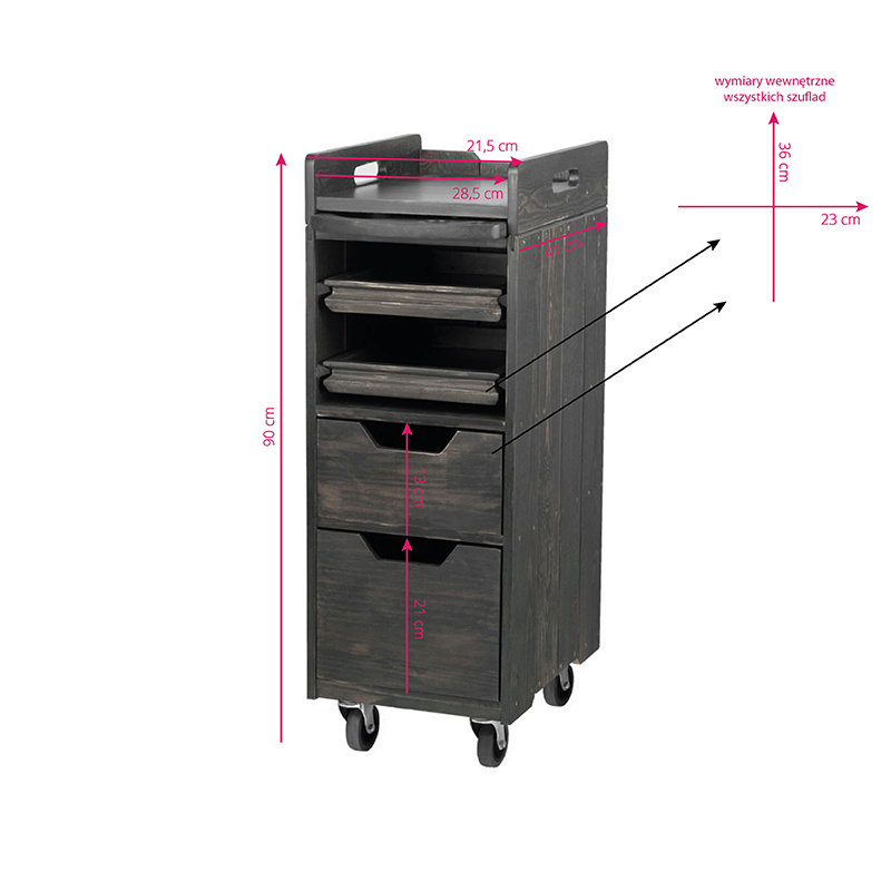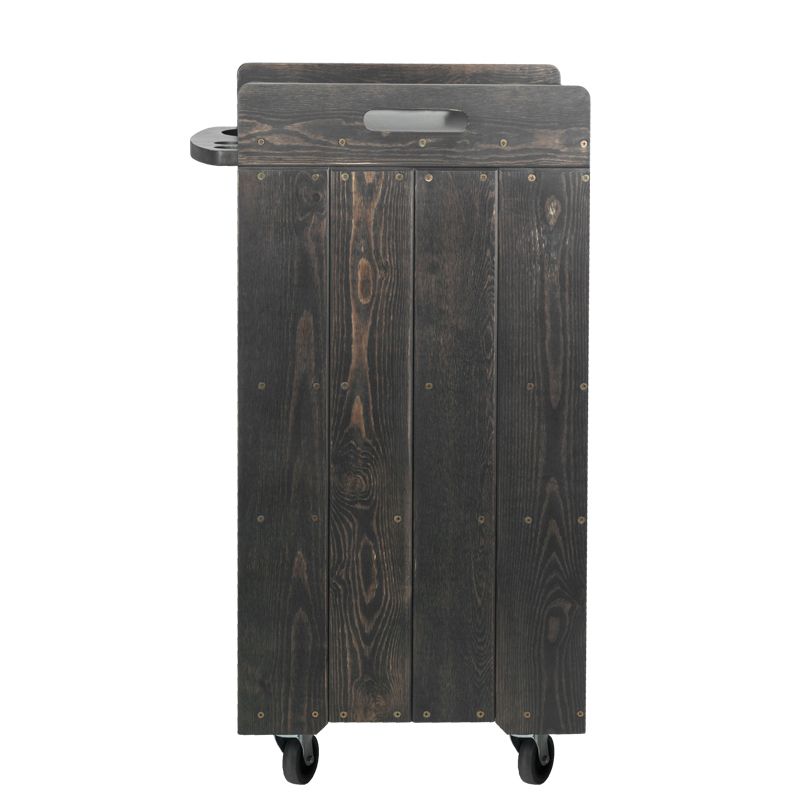 kappers werkwagen hout 991 grijs Kappers werkwagen gemaakt van massief hout. het heeft twee lades, twee uittrekbare kattenbakken en een opvouwbare plank met gaten voor een droger en andere accessoires.