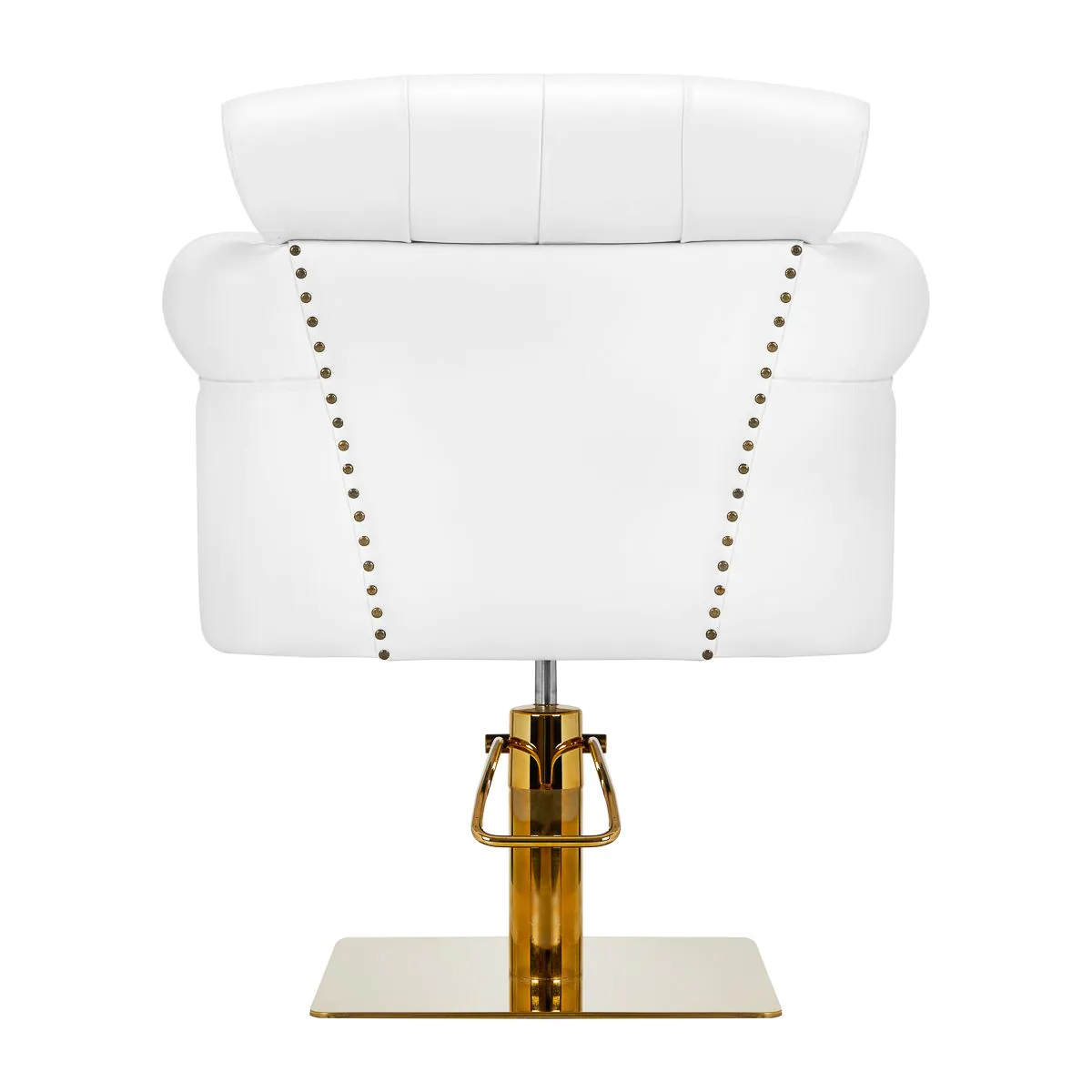 Het functionele meubelstuk is gevuld met duurzaam, vervormingsbestendig schuim en de bekleding is gemaakt van aangenaam aanvoelend synthetisch leer in wittinten. De gebruikte materialen zorgen voor langdurig comfortabel gebruik van het meubilair en maken de apparatuur vochtbestendig, duurzaam en gemakkelijk schoon te maken. Decoratieve quilts en goudkleurige elementen geven het een tijdloze elegantie. De Gabbiano Berlin kappersstoel onderscheidt zich door een exclusief ontwerp, waardoor hij een uniek karakter krijgt en hij prachtig staat in veel kapsalons.
