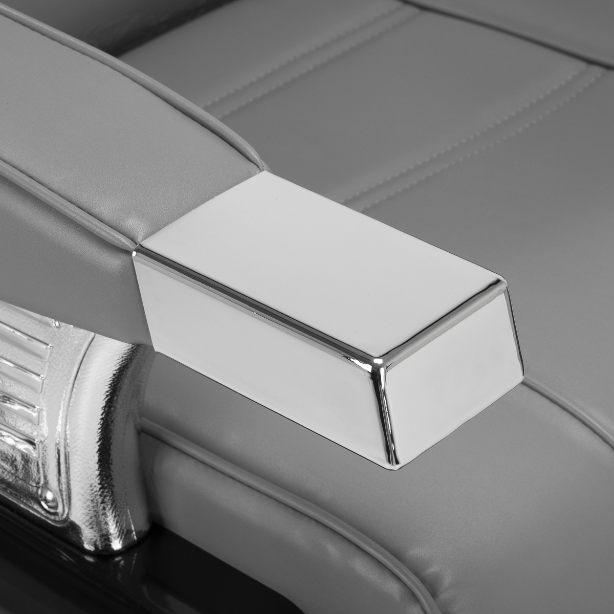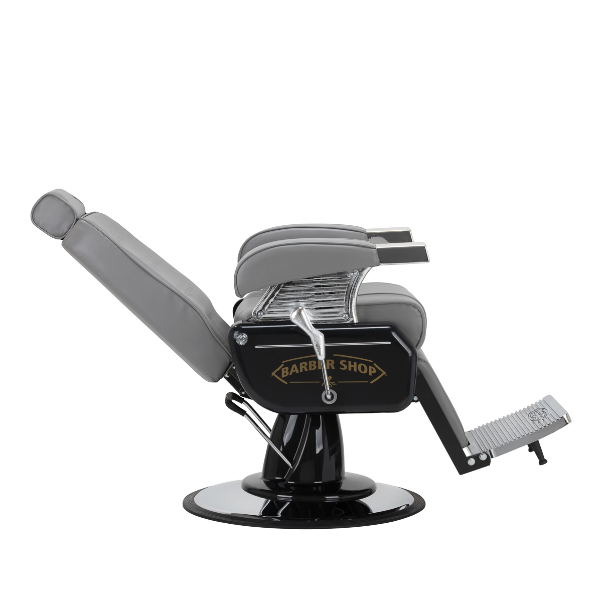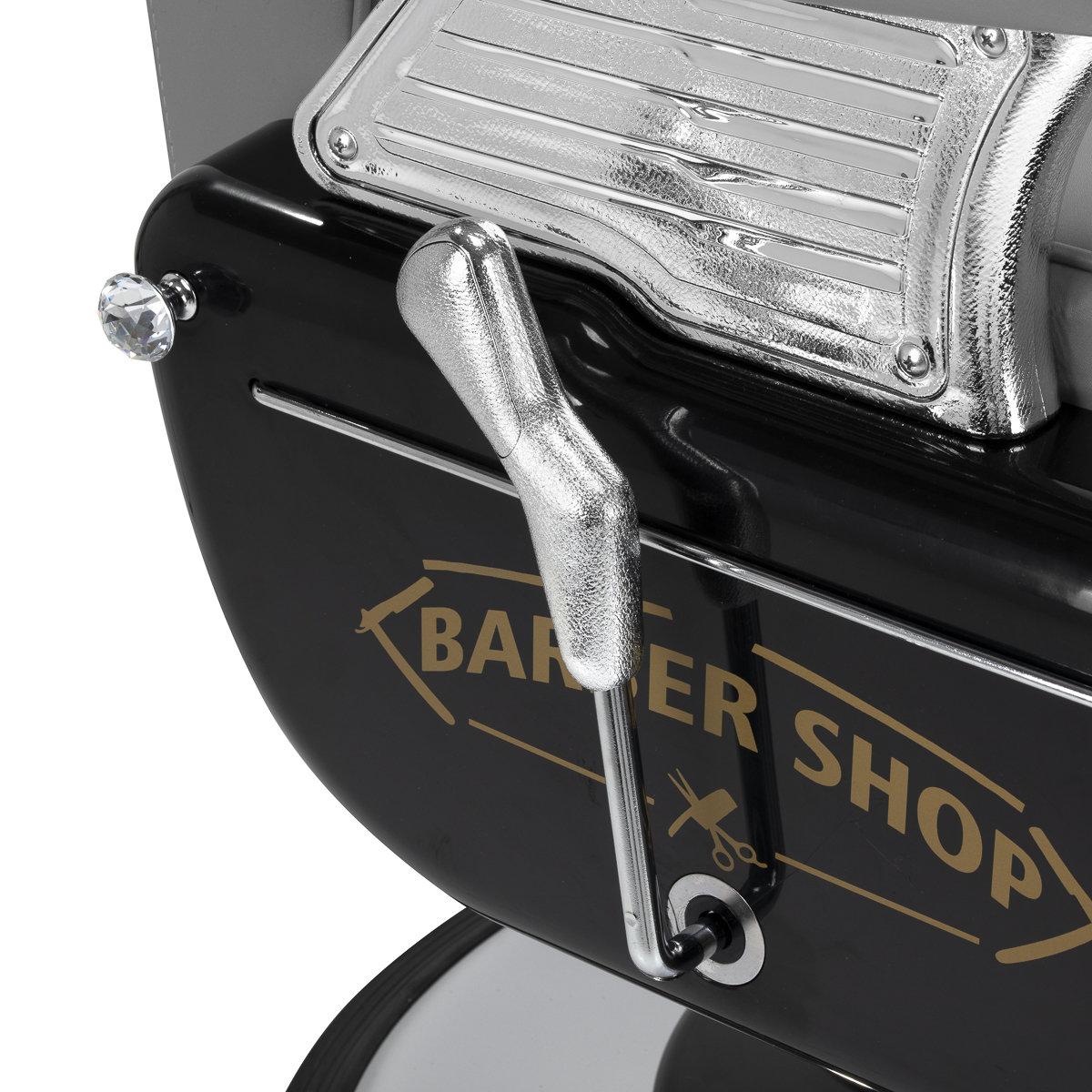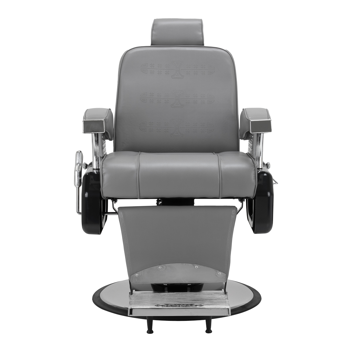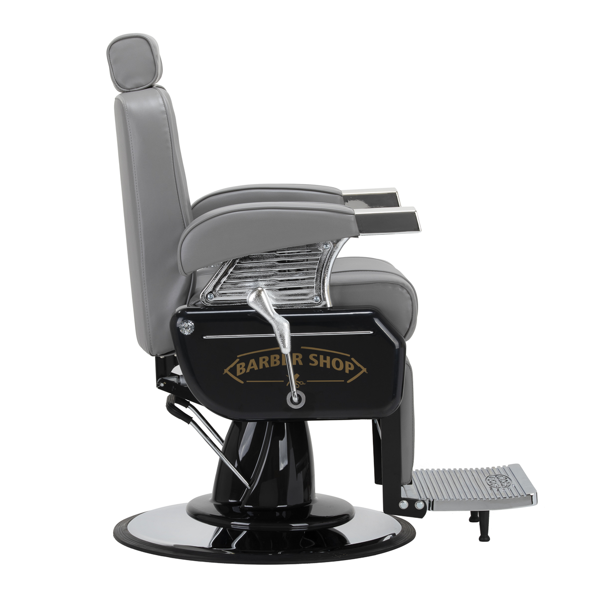 De solide constructie garandeert stabiliteit en hoog gebruikscomfort. De zitting gevuld met vervormingsbestendig schuim en de bekleding van hoogwaardig glad kunstleer zorgen voor duurzaamheid en comfort gedurende lange tijd. De gebruikte materialen zijn duurzaam, vochtbestendig en gemakkelijk schoon te maken, wat de stoel een praktische keuze maakt voor dagelijks gebruik. De grijze tint van de bekleding geeft de stoel een elegante en tijdloze stijl die perfect past in de inrichting van kapperszaken. De algehele look wordt aangevuld door stijlvol reliëf op de rugleuning, versieringen op de voetsteun, decoratieve elementen aan de zijkanten en een subtiel, glinsterend kristal. Deze details benadrukken het luxueuze karakter van de kappersstoel, waardoor deze een uniek onderdeel is van de uitrusting van elke salon.