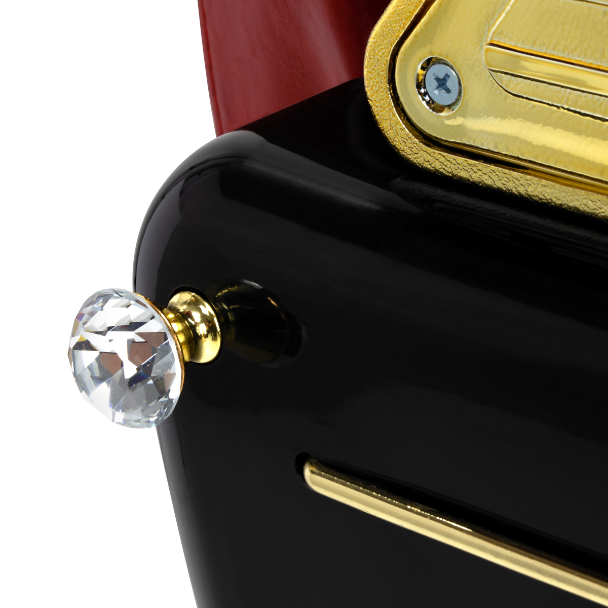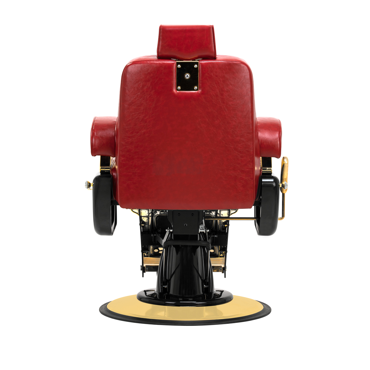 De solide constructie garandeert stabiliteit en hoog gebruikscomfort. De zitting gevuld met vervormingsbestendig schuim en de bekleding van hoogwaardig kunstleer met een aparte structuur zorgen voor duurzaamheid en comfort gedurende lange tijd. De gebruikte materialen zijn duurzaam, vochtbestendig en gemakkelijk schoon te maken, wat de stoel een praktische keuze maakt voor dagelijks gebruik. De rode tint van de bekleding geeft de stoel een elegante en tijdloze stijl die perfect past in de inrichting van kapperszaken. De algehele look wordt aangevuld door stijlvol reliëf op de rugleuning, versieringen op de voetsteun, decoratieve elementen aan de zijkanten en een subtiel, glinsterend kristal. Deze details benadrukken het luxueuze karakter van de kappersstoel, waardoor deze een uniek onderdeel is van de uitrusting van elke salon.
