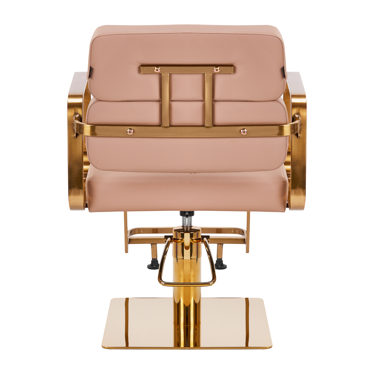 Het volledige rotatiemechanisme van de stoel maakt het werk van de kapper effectiever en comfortabel. Een stevige, platte, vierkante basis garandeert stabiliteit tijdens gebruik. Het mat afgewerkte, gladde oppervlak geeft het element een elegante uitstraling en maakt het gemakkelijk schoon te houden. Een comfortabele zitting met schuimvulling zorgt voor hoog gebruikscomfort, zelfs tijdens vele uren behandelingen. Geometrische, metalen armleuningen in goudtinten zorgen voor de juiste positionering van de schouders van de cliënt – dit betekent dat hij zijn hoofd niet in zijn schouders steekt of onderuit hangt – wat het uitvoeren veel gemakkelijker maakt nauwkeurige behandelingen, inclusief knipbeurten. Een stijlvolle voetsteun speciaal voor dit model biedt stabiele ondersteuning voor de voeten van de gebruiker.