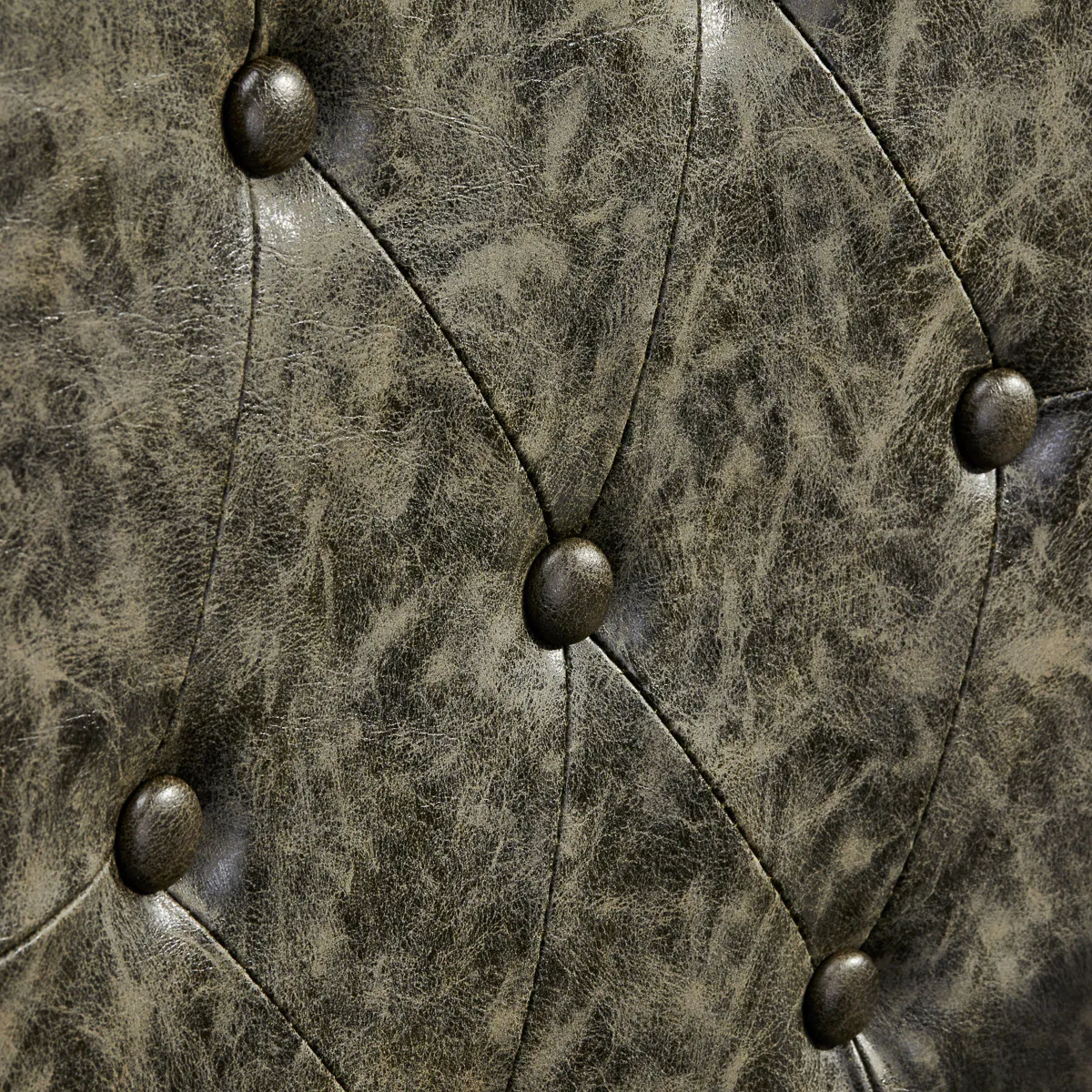 De solide constructie van de basis zorgt voor stabiliteit en hoog gebruikscomfort. De zittingvulling is gemaakt van duurzaam, vervormingsbestendig schuim en de bekleding is gemaakt van aangenaam aanvoelend synthetisch leer met een versleten, deels matte afwerking met een verouderd effect, waardoor de duurzaamheid van het meubilair en het comfortabele gebruik worden gegarandeerd voor een lange tijd. Ze maken de apparatuur ook bestand tegen vocht, duurzaam en gemakkelijk schoon te maken. De bekleding in groentinten met stiksels en decoratieve knopen geeft het geheel een uniek karakter. De stoel met een karakteristiek design, verwijzend naar de vintage stijl, past perfect bij de sfeer van kapperszaken en benadrukt hun unieke sfeer.