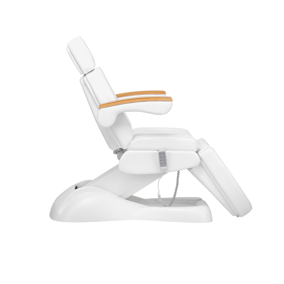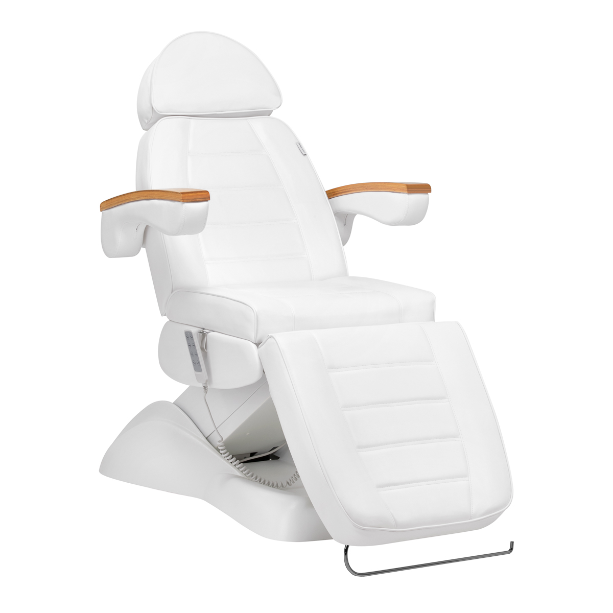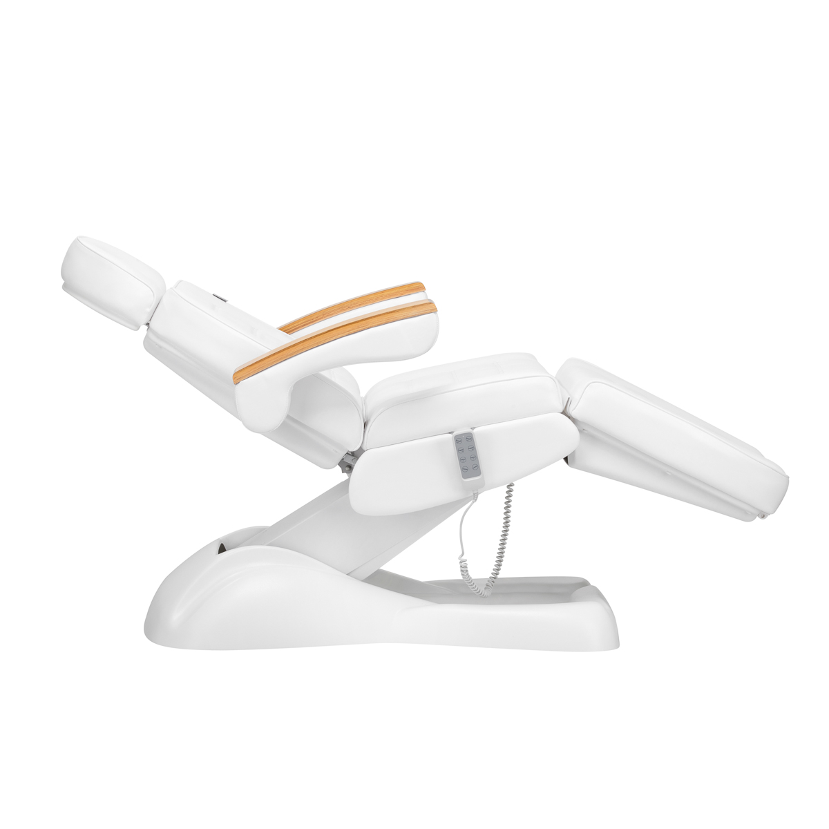 Met behulp van een intuïtieve afstandsbediening kan de fauteuil traploos in hoogte worden versteld vier vlakken – het heeft hoogteverstelling, rugleuning- en voetsteunhoeken en een wiegfunctie. Hierdoor kunt u de positie vrij aanpassen afhankelijk van de behandeling die op dat moment wordt uitgevoerd, wat zowel het comfort van de gebruiker als de persoon die de diensten uitvoert beïnvloedt.
