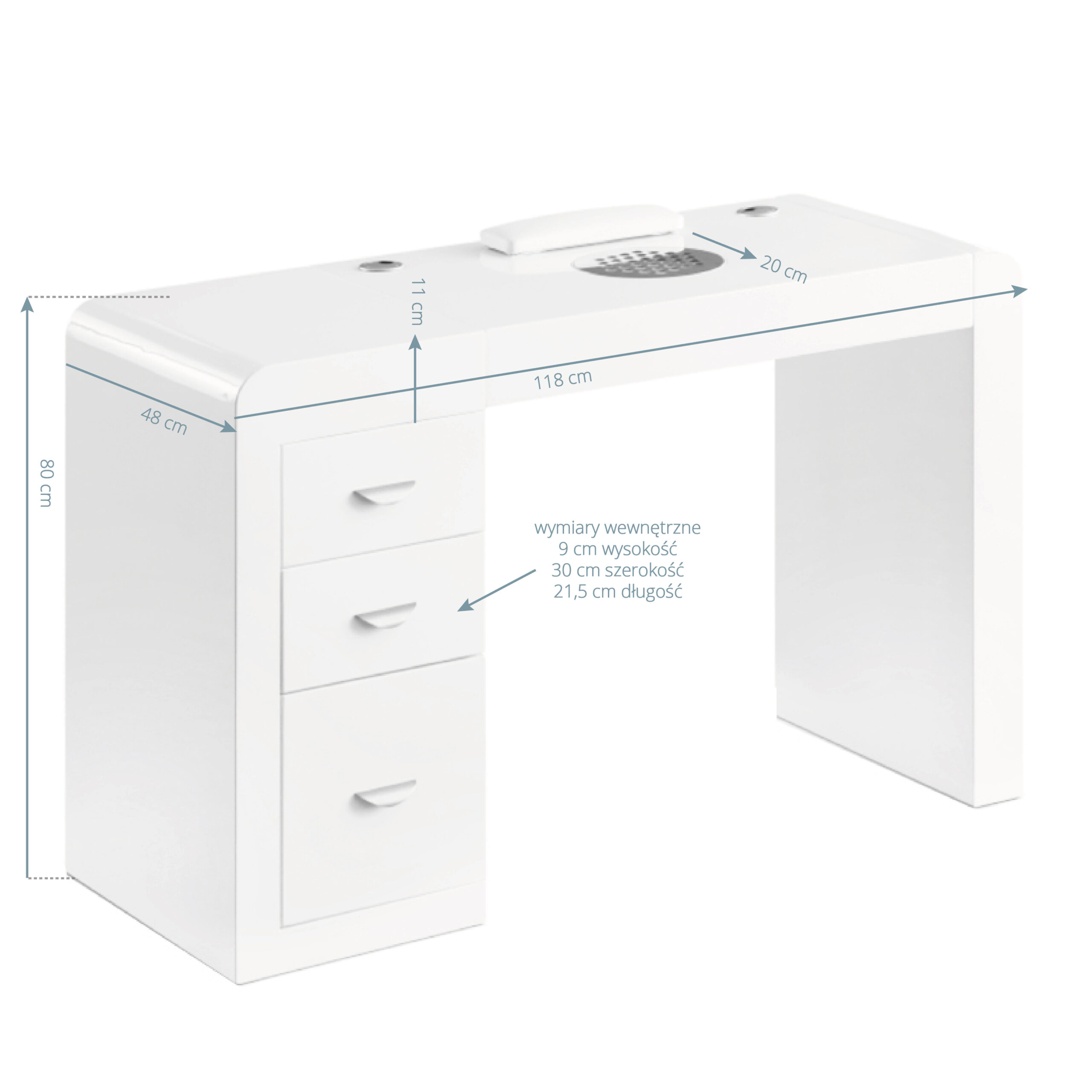 Drie ruim lades maken het gemakkelijker om de meest noodzakelijke cosmetica en gereedschappen op orde te houden. Het manicuretafel en nageltafel is uitgerust met een praktische afzuiging die de hoeveelheid schadelijk stof effectief vermindert, waardoor schone en frisse lucht op de werkplek ontstaat. Tegelijkertijd neemt hij dankzij de integratie in het tafelblad geen waardevolle werkruimte in beslag. Speciaal ontworpen plaatsen voor kabels maken het gemakkelijker om de benodigde apparaten in de salon te ordenen, zoals nagelboormachines, behandellampen of nagellampen, waardoor u de kabels kunt verbergen.