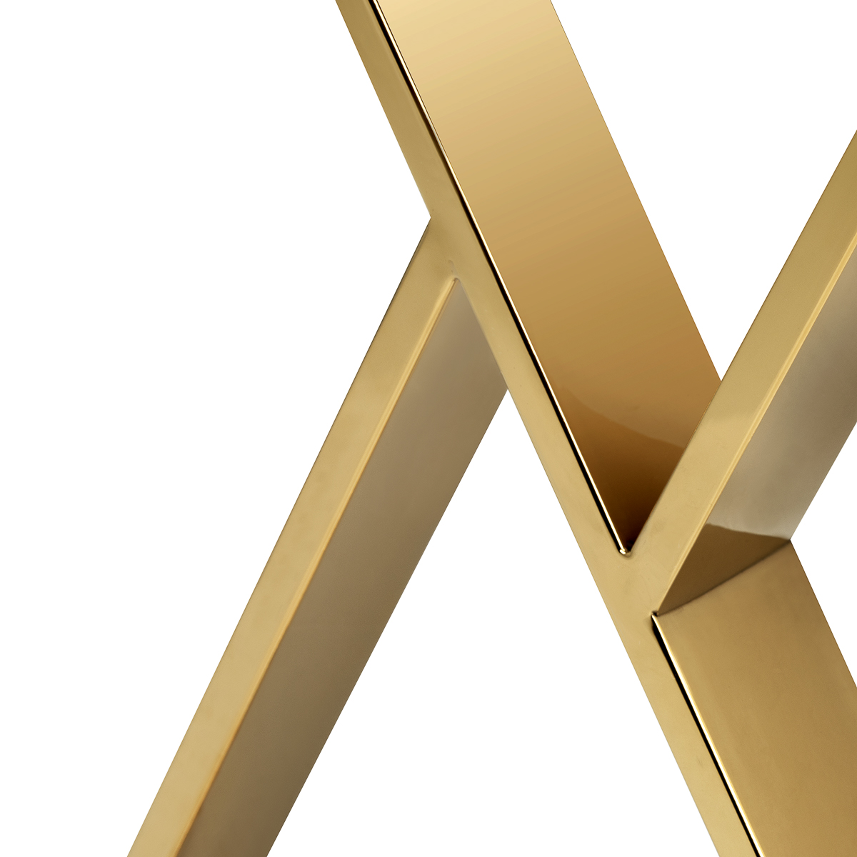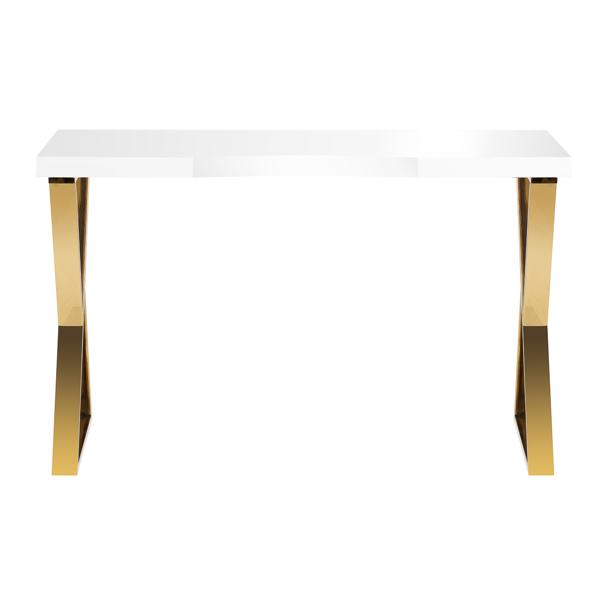 Het hoogglans witte blad en de geometrische, gouden poten geven het bureau een lichtheid en een modern karakter. Dankzij de lichte vorm past het bureau zowel in intieme als ruime interieurs, en benadrukt het exclusieve karakter. Het is een uitstekende investering in esthetiek en comfort voor dagelijks werk.