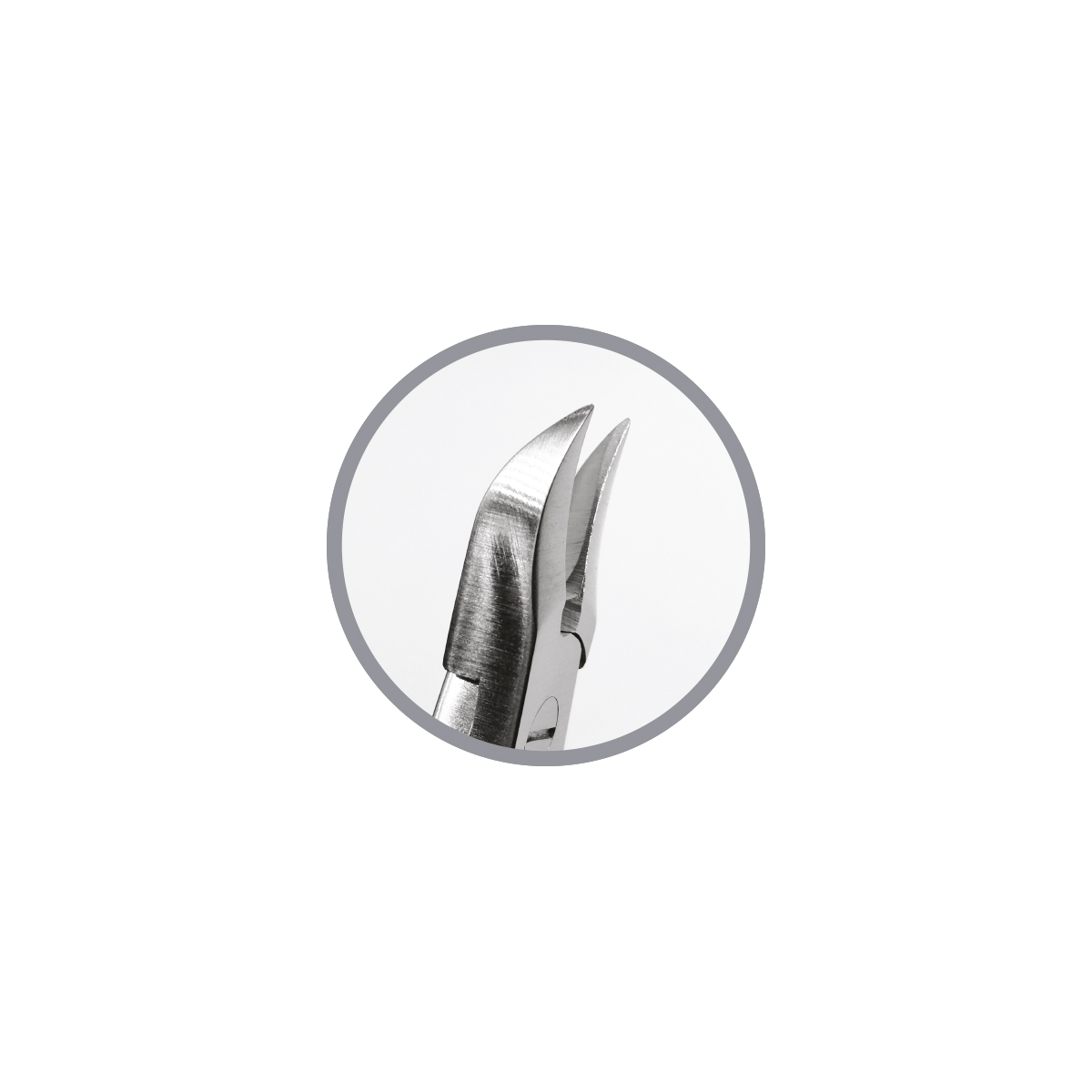 De tang met een gebogen lemmet (zijkant) is gemaakt van roestvrij staal van de hoogste kwaliteit. Dit is een duurzaam en nauwkeurig gereedschap met een scherp snijvlak (1,6 cm). Het speciale ontwerp van het lemmet maakt de tang uitstekend geschikt voor het inkorten van halfronde nagels. Het model is uitgerust met een beschermd mechanisme met twee veren. Het gereedschap kan worden gesteriliseerd in een autoclaaf. De tang wordt met name aanbevolen voor gebruik in cosmetische en podotherapeutische ingrepen.