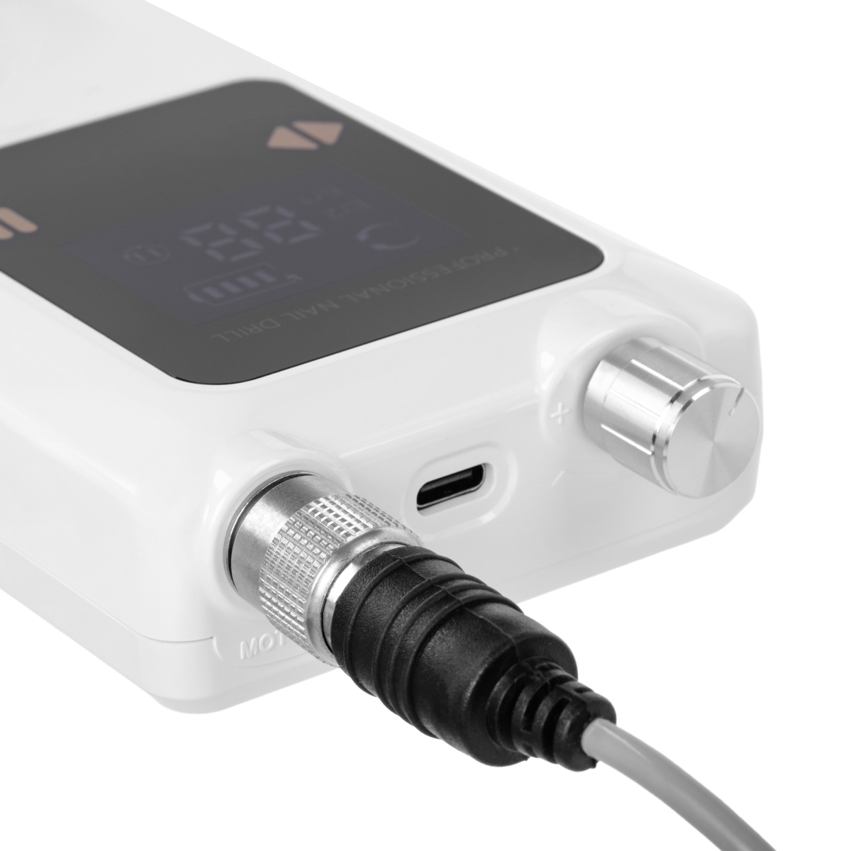 De ingebouwde 2000 mAh-batterij maakt tot 9 uur gebruik mogelijk op één lading. De nagelfrees werkt stil, waardoor storende geluiden worden geëlimineerd en zowel de behandelaar als de cliënt comfort ervaren.