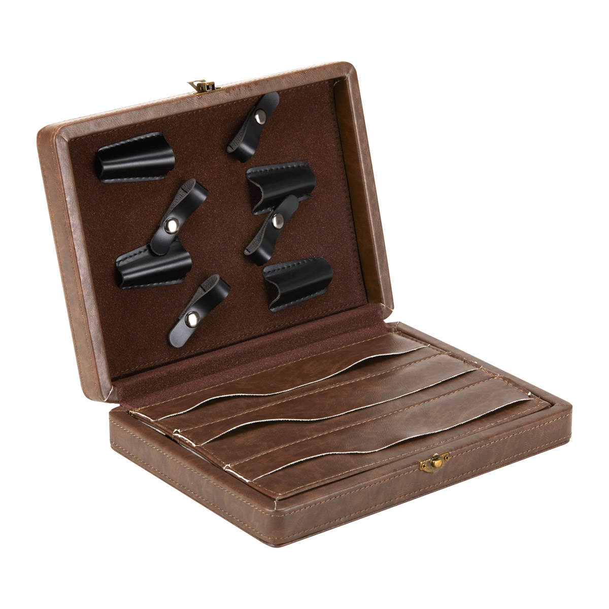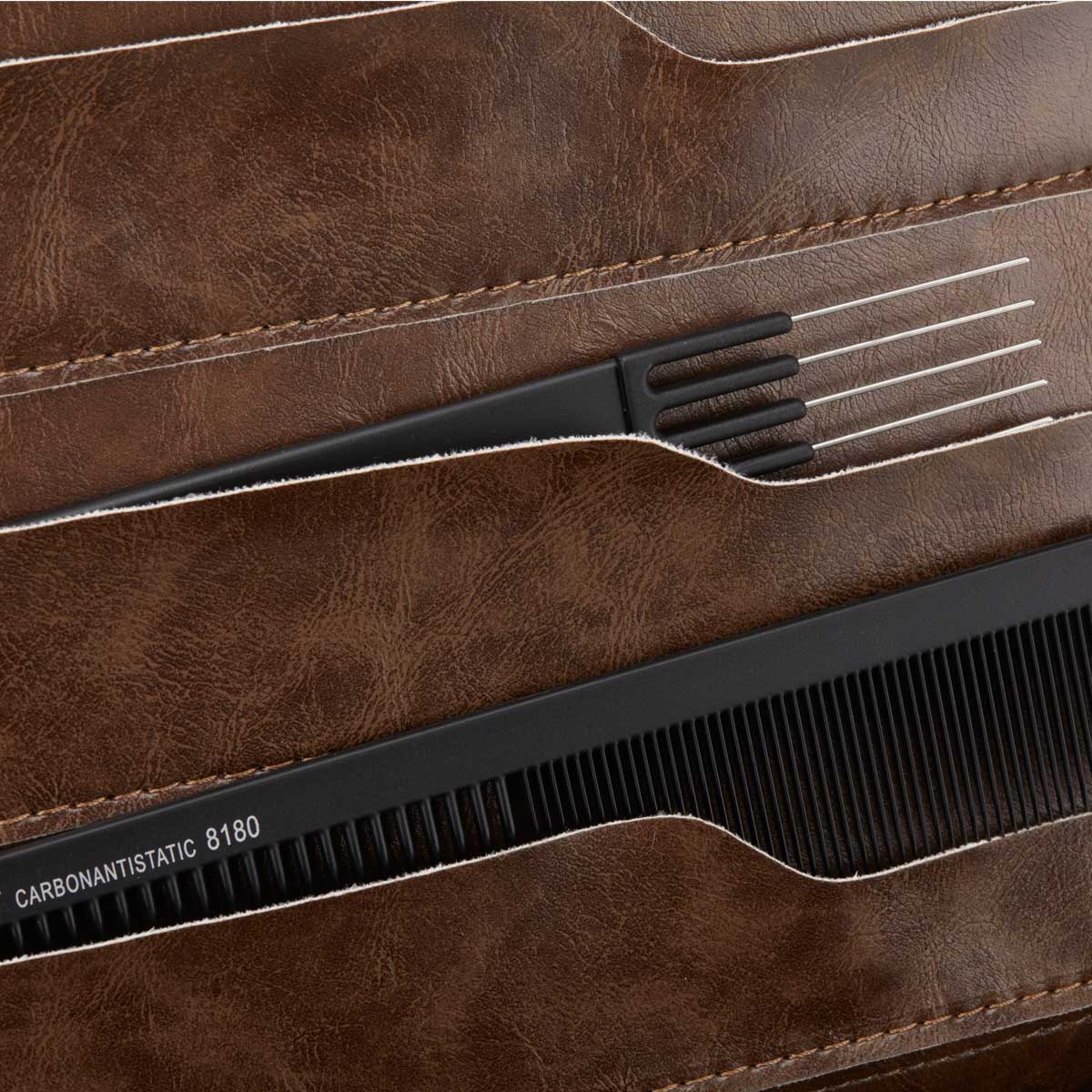 Elegante en praktische organisator voor schaar bedekt met ecologisch leer. Binnenin heeft er twee uitsparingen met schaargrepen en een partitie ontmoette enveloppen. De organisator is gesloten, ontmoette een metalen vergrendeling. Aan de voorkant is er een reliëfafbeelding die een kappersthema heeft ontmoet. Aantal handgrepen: 8 in beide uitsparingen. Toereiken enveloppen: 3 aan elke kant van het onderdeel. Dimensies: 27 cm (h) x 20 cm (w) x 6 cm (d)