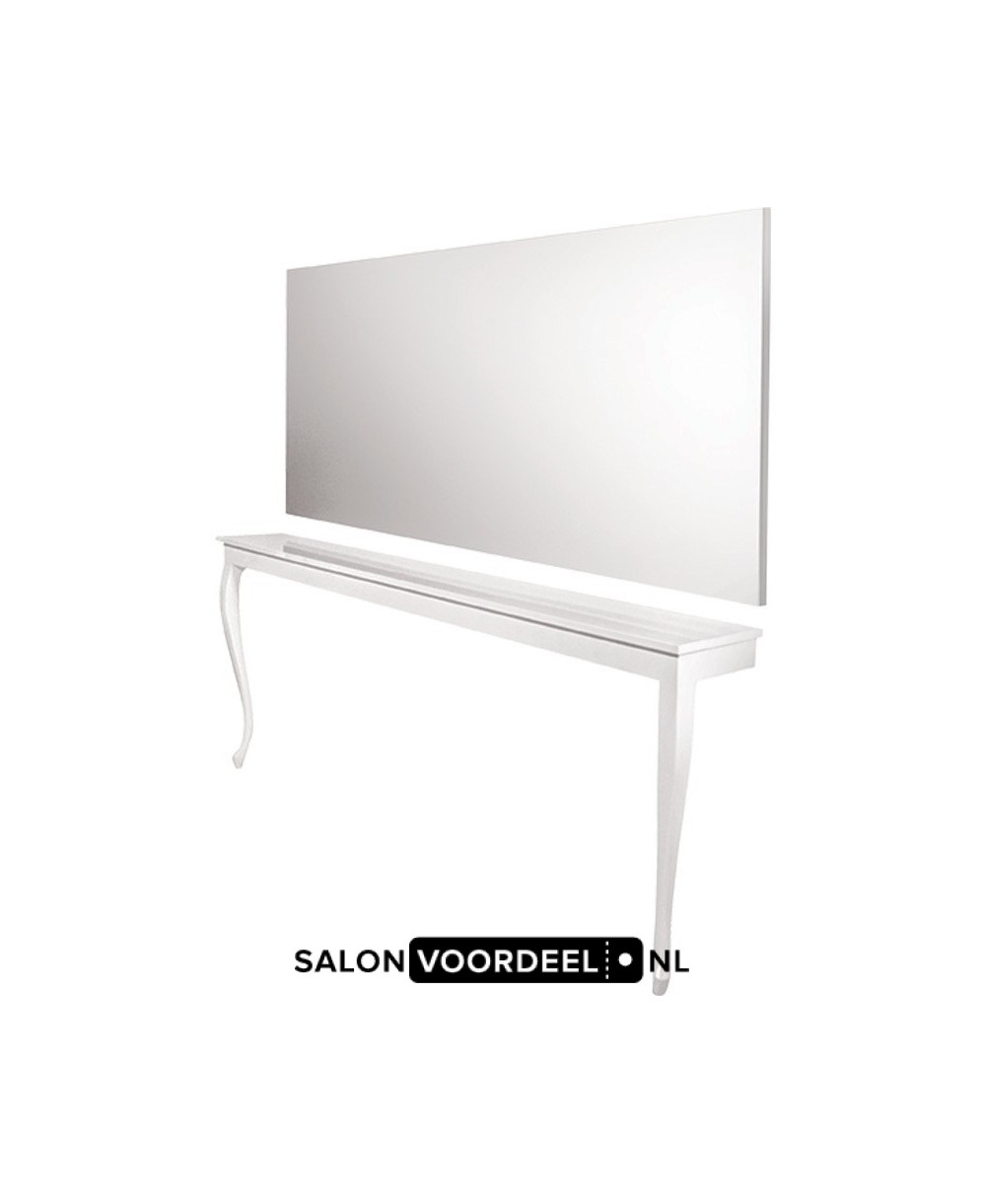 Prachtige kaptafel voor 2 personen. Houten frame en poten. Top verkrijgbaar in 16 kleuren prefinished board. Hoogglans uitvoering of mat. Totale hoogte: 1.63 mtr. Breedte: 2.01 mtr. Diepte: 27 cm.