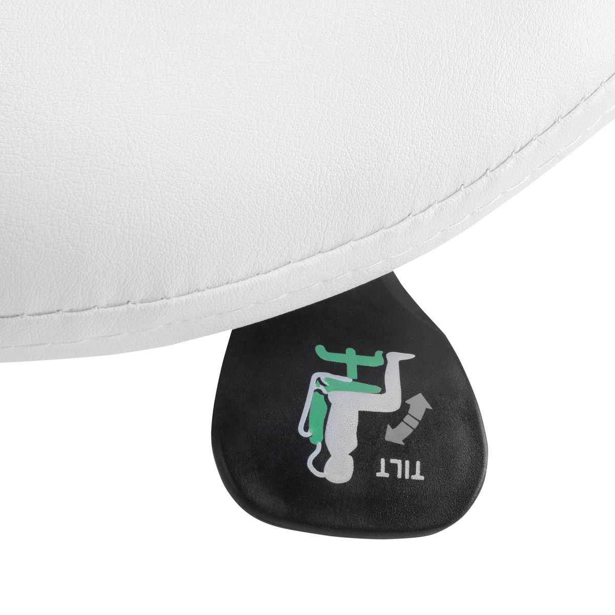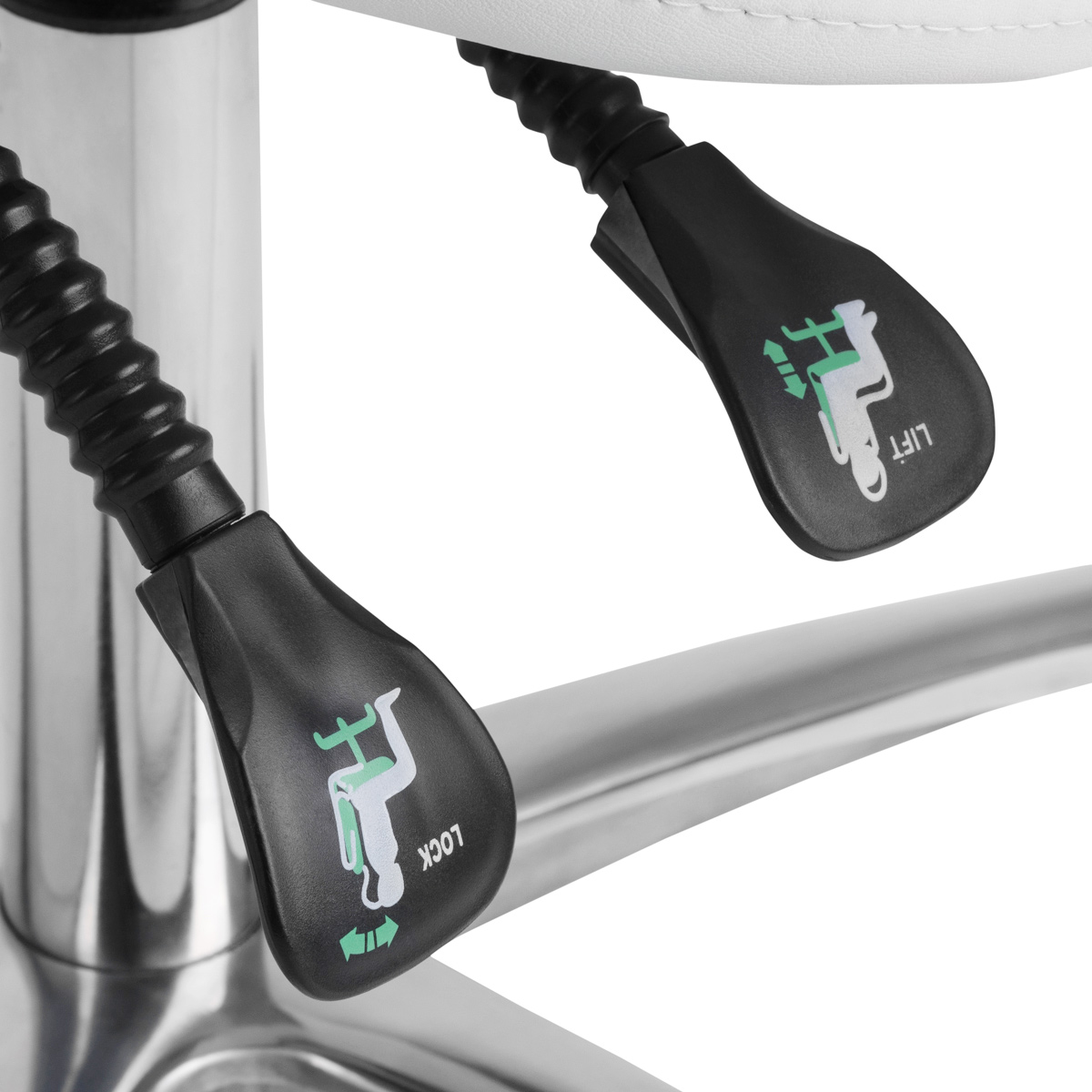 Comfortabele, exclusieve, stabiele cosmeticakruk met rugleuning en geprofileerde zitting, op een vijfsterren, zeer stabiele basis. Verstelbaar in drie vlakken: