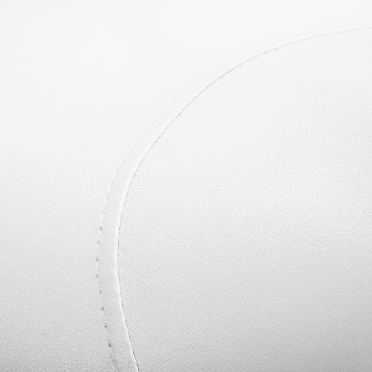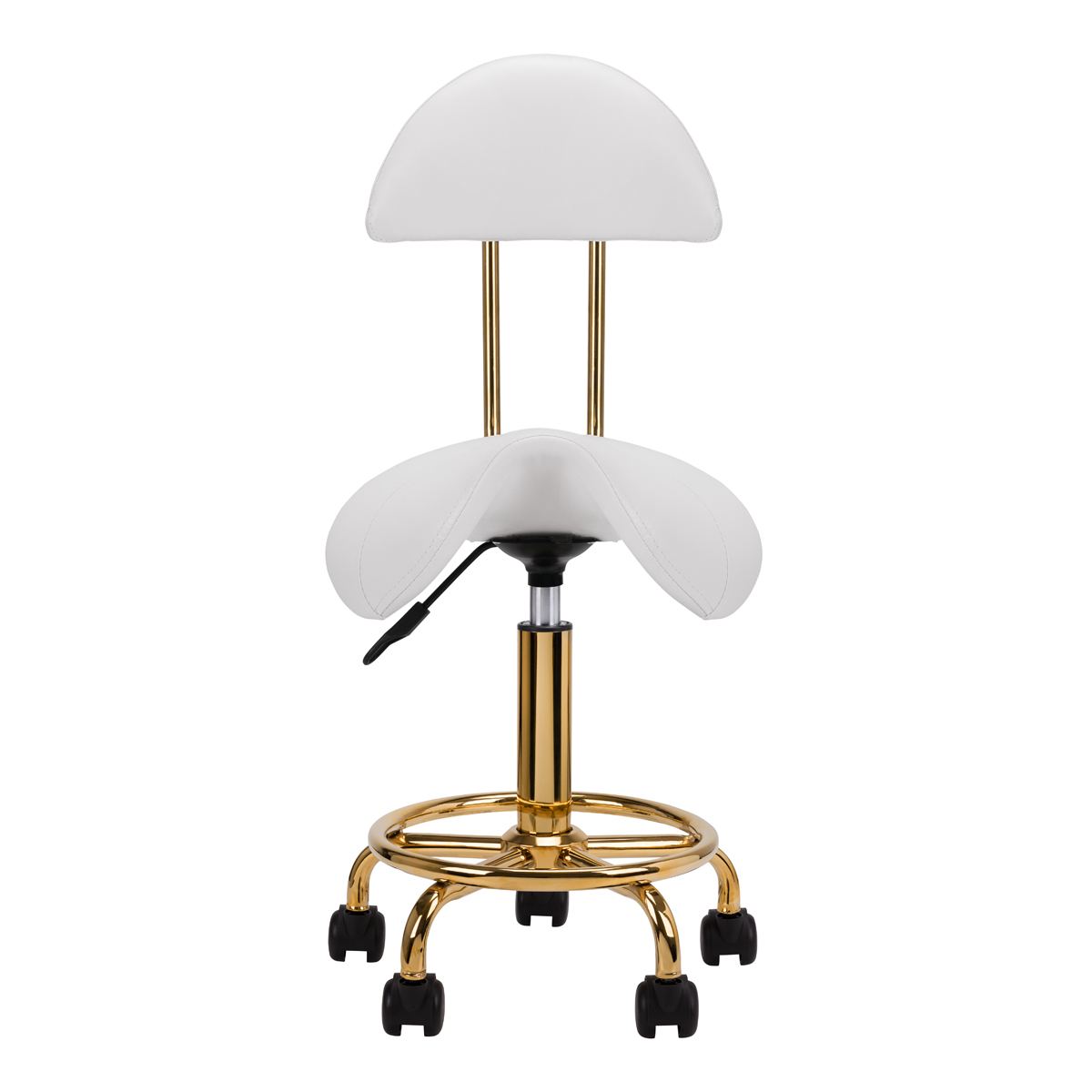 Comfortabele, stabiele cosmeticakruk met rugleuning, voorzien van geprofileerde zitting, goudkleurige metalen elementen. Op vijfsteronderstel met kunststof wielen. Verkrijgbaar in het wit, een noodzakelijk meubelstuk in een schoonheidssalon. Gelakte metalen oppervlakken.