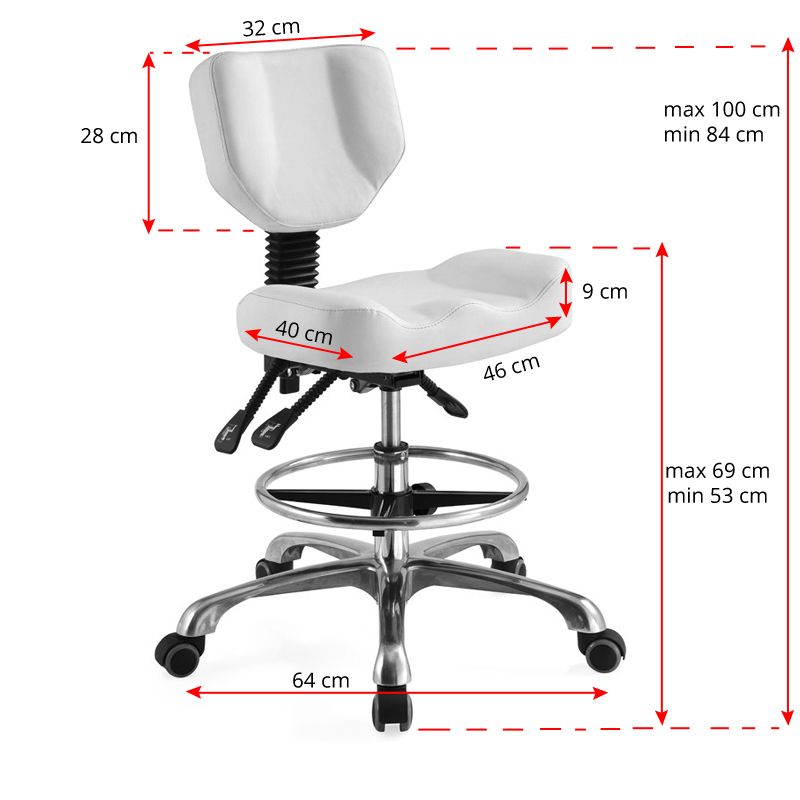 het nieuwste model van een Cosmetische tabouret kruk. ongelooflijk comfortabel. Dankzij de regeling in drie vlakken kunt u de positie van de stoel optimaal optimaliseren. naast de verstelling in het verticale vlak kunnen we de hoek van de rugleuning en de zithoek instellen. perfect voor lange werkuren. een hoepel om de benen boven de voetsteunen te ondersteunen. de kleur van de bekleding van de fauteuil is wit. afmetingen verpakking 60x60x35cm