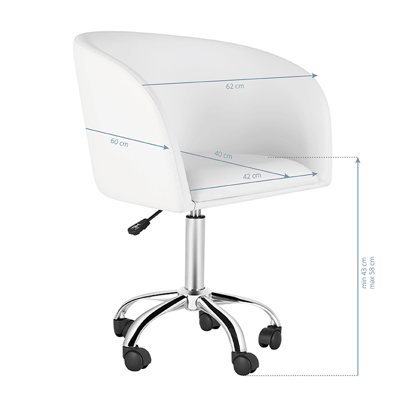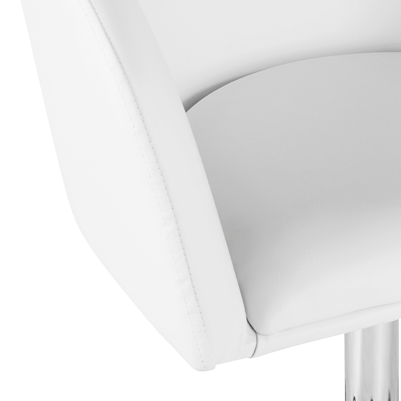 Moderne witte Tabouret. Een zeer comfortabele stoel met een moderne uitstraling. Hoogwaardig eco-leer garandeert een eenvoudiger onderhoud van het meubel. De stoel is op en neer verstelbaar. Rubberen wielen.