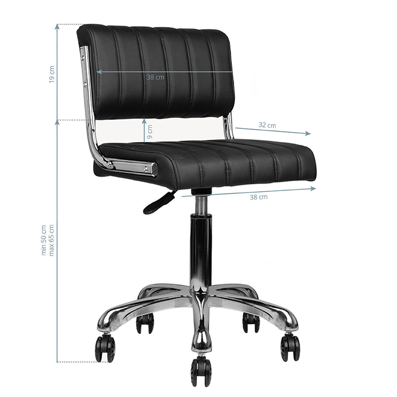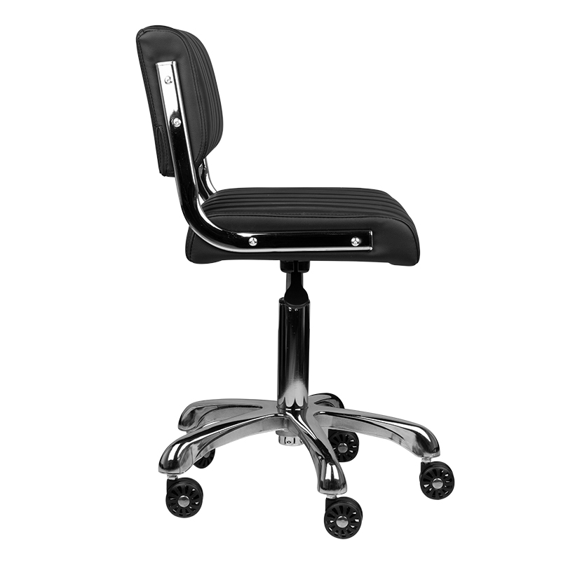 zwarte tabouret met een gestikte zitting en een comfortabele rugleuning. hij is in hoogte verstelbaar en de basis van de draagarm is voorzien van rubberen wielen.