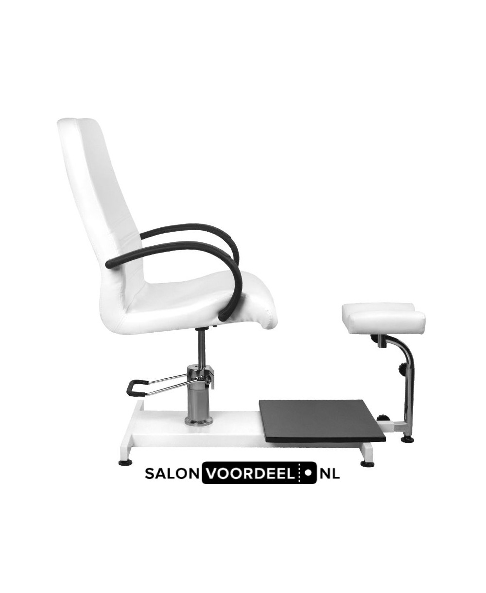 stoel cosmetische verhoogd en hydraulisch neergelaten, ideaal voor gebruik in een pedicure. Swivel met slot, met handmatige hoogte verstelbare voetensteun en een stenen plaat onder een kom. Plating wasbare gemaakt van eco-leer, die voldoen aan de strenge eisen van de EU, esthetische, vernikkelde metalen onderdelen. De zitting is verkrijgbaar in wit met zwarte armsteunen en de plaat onder de kom.