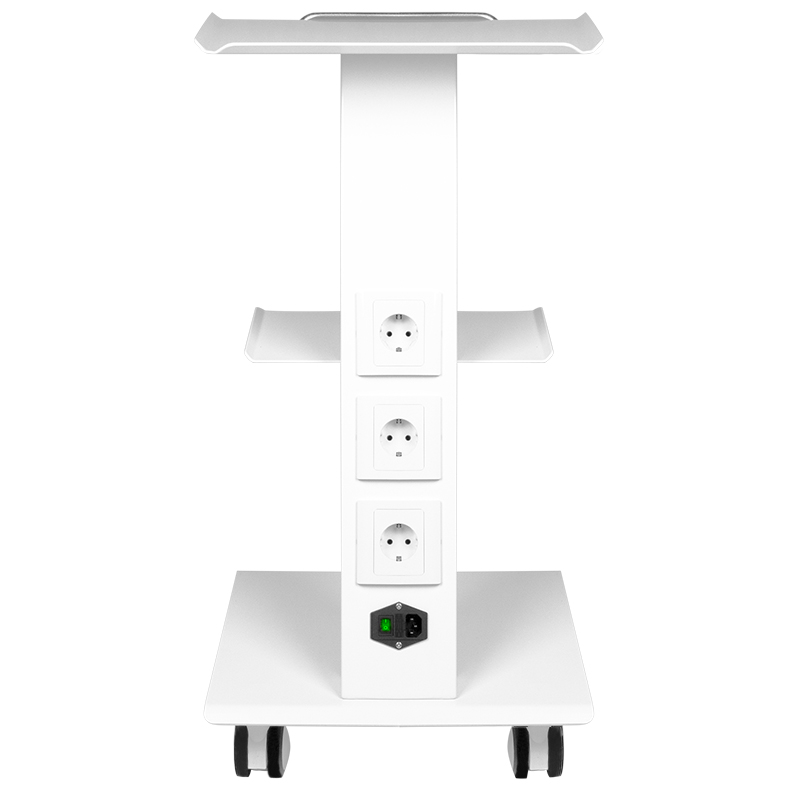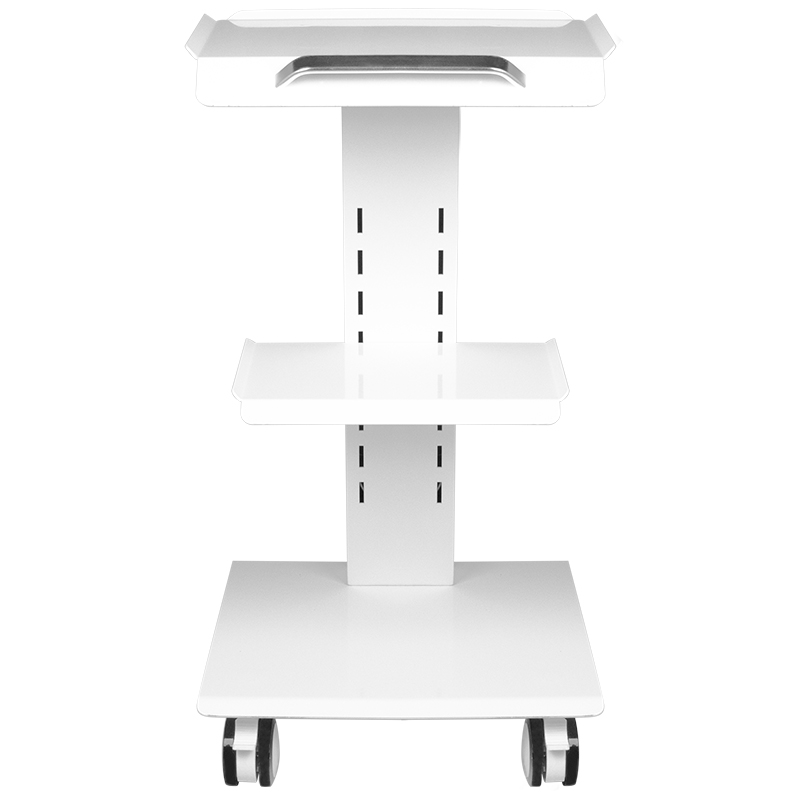 Functionele, volledige metalen tafel met rubberen wielen voldeden aan een vergrendelingsfunctie. Het is perfect als een tafel voor cosmetische apparaten. Het heeft twee planken, waarvan er één verstelbaar is in hoogte en een handvat voor eenvoudig bewegen. Dankzij de wielen is de tafel mobiel en gemakkelijk te verplaatsen. Het meubel dat tijdens het werk gemak en comfort biedt.