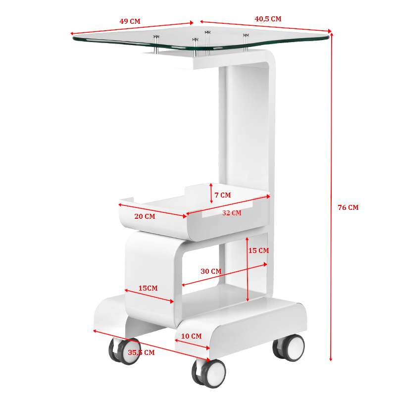 Functionele, metalen en glazen tafel met rubberen wielen voldeden aan een blokkeerfunctie. Perfect als een tafel voor een cosmetische apparaat. Het heeft een stabiele plank voor het apparaat en een andere plank voor accessoires, en dankzij het wiel is de tafel mobiel en gemakkelijk te verplaatsen. Het meubel dat tijdens het werk gemak en comfort biedt. Afmetingen: Hoogte: 76 Breedte: 40.5