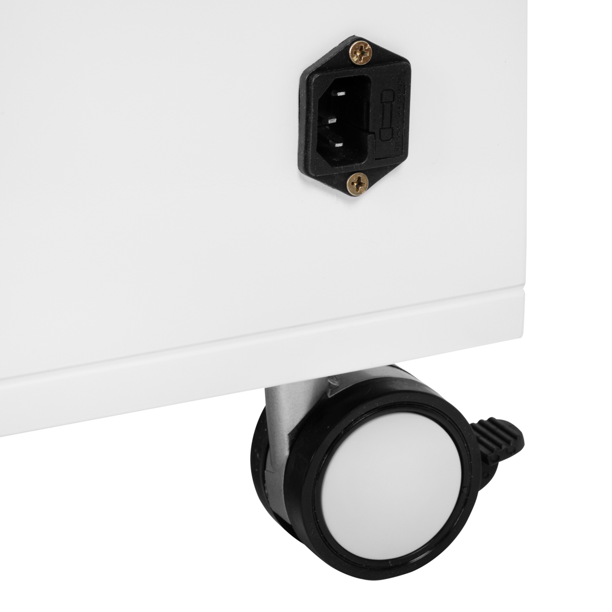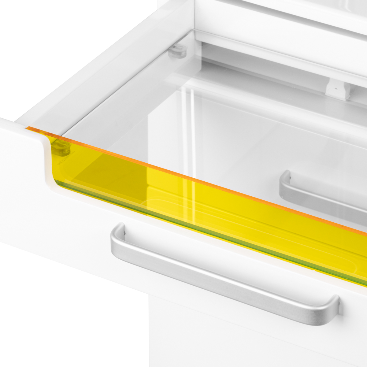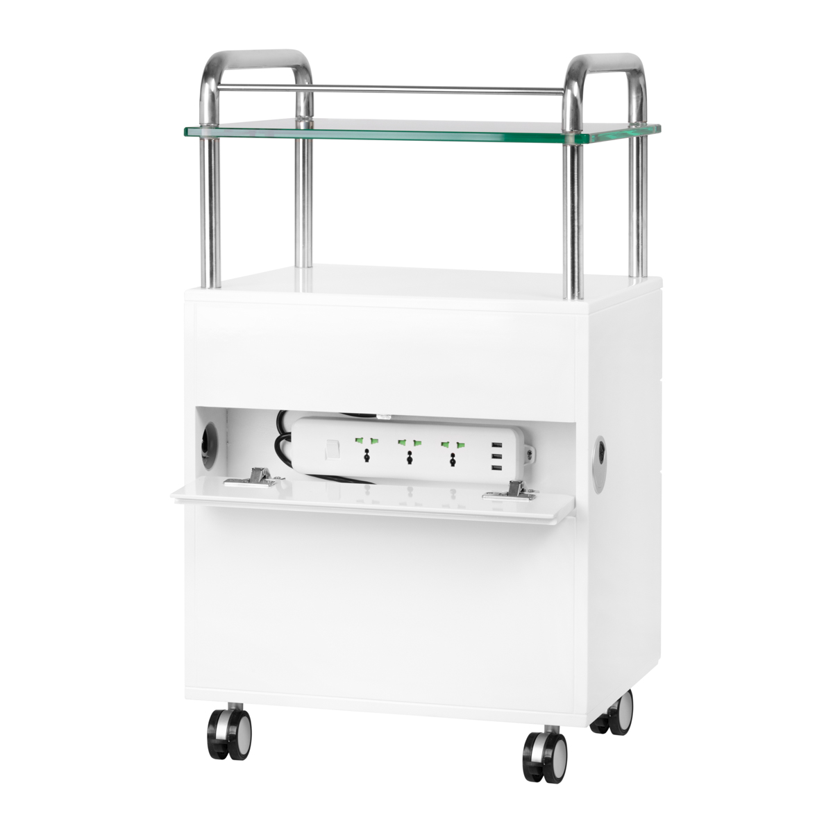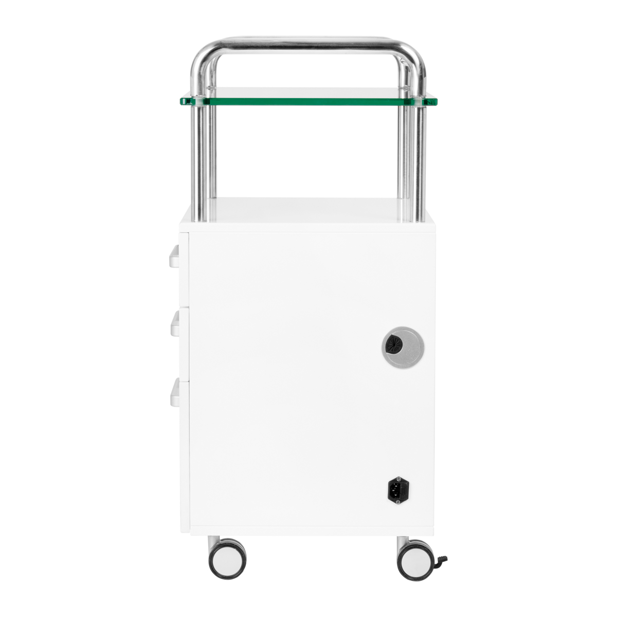 Een hoogwaardige Werktafel Werkwagenis een functioneel cosmetische stuk meubel op wielen. Dankzij uw mobiliteit kunt u het naar andere behandelkamers vervoeren. De assistent heeft een glazen werkblad, drie laden voor gereedschappen, accessoires en een plank voor een podotherapie -pedicuremotor of ander apparaat. Eén lade heeft een ingebouwde UV-C-lamp voor een betere steriliteit van gereedschappen en accessoires.