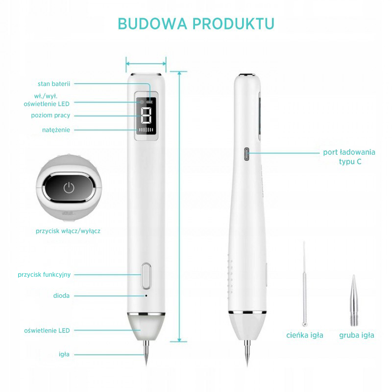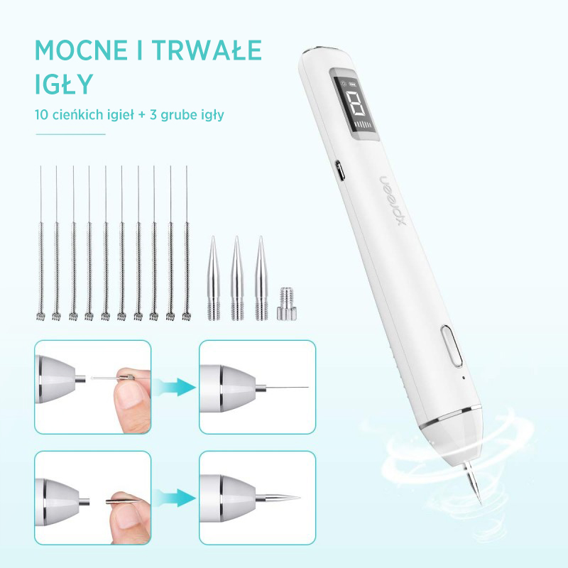 XPreen Professional Spot Remover maakt gebruik van geavanceerde Duitse 6e generatie technologie. Het is gemakkelijk te hanteren en effectief te gebruiken. Het apparaat wordt gebruikt om bijvoorbeeld tatoeages, littekens, wratten of fibromen te verwijderen. Heeft 8 intensiteitsniveaus, druk gewoon op de aan / uit -knop om niveaus te selecteren. Het hoofd staat onder boren ontmoette een LED -diode die helpt om precies op het punt te streven. LCD -display toont het batterijdiveau en het werkniveau. gestroomlijnd ontwerp voor een elegante look. Specificaties: Materiaal: ABS + stalen naaldbatterijcapaciteit: 800 mAh 3.7V Ingangstroom: 5V / 1A Uitgang Vermogen: Max5W Productgrootte: 182 * 26 * 26 mm Product Gewicht: 75G Pakket Maat: 194 * 96 * 36 mm Pakket Gewicht: 195G Wij zouden u graag laten weten dat het op grond van kunst. 38 Punt 5 van de wet op consumentenrechten, vanwege gezondheidsbescherming en hygiëne, is het recht op METDRAW van een afstandscontract niet van toepassing op producten die worden geleverd in verzegelde verpakkingen, als de verpakking na levering is geopend. De kit omvat: – pen – 10 stks. Fijne naalden + handvat – 3 pc’s. Dikke naalden (inclusief een extra naalddeksel) – USB -kabel – Gebruikershandleiding Start het apparaat: 1. Monteer de naald door deze met de klok mee te draaien. 2. AAN / UIT: Druk 2 seconden op de aan / uit -knop om in- / uitschakelen. LCD -scherm toont de batterijindicator en het niveau. 3. Selecteer niveaus: kort druk op de aan / uit-knop om het niveau van 1-8 in te stellen.