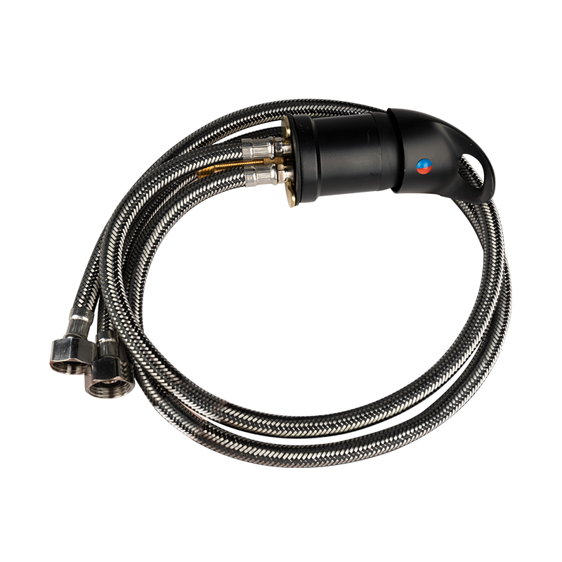 Mixer -batterij die geschikt is voor de meeste kappersspoelen beschikbaar in Nederland. Brass kraan, Zwart afwerking ontmoette hoge weerstand. Verbindingsslangen beveiligd ontmoette een stalen vlecht, die duurzaamheid garandeert. De batterij is compleet en klaar voor installatie in een wasunit.