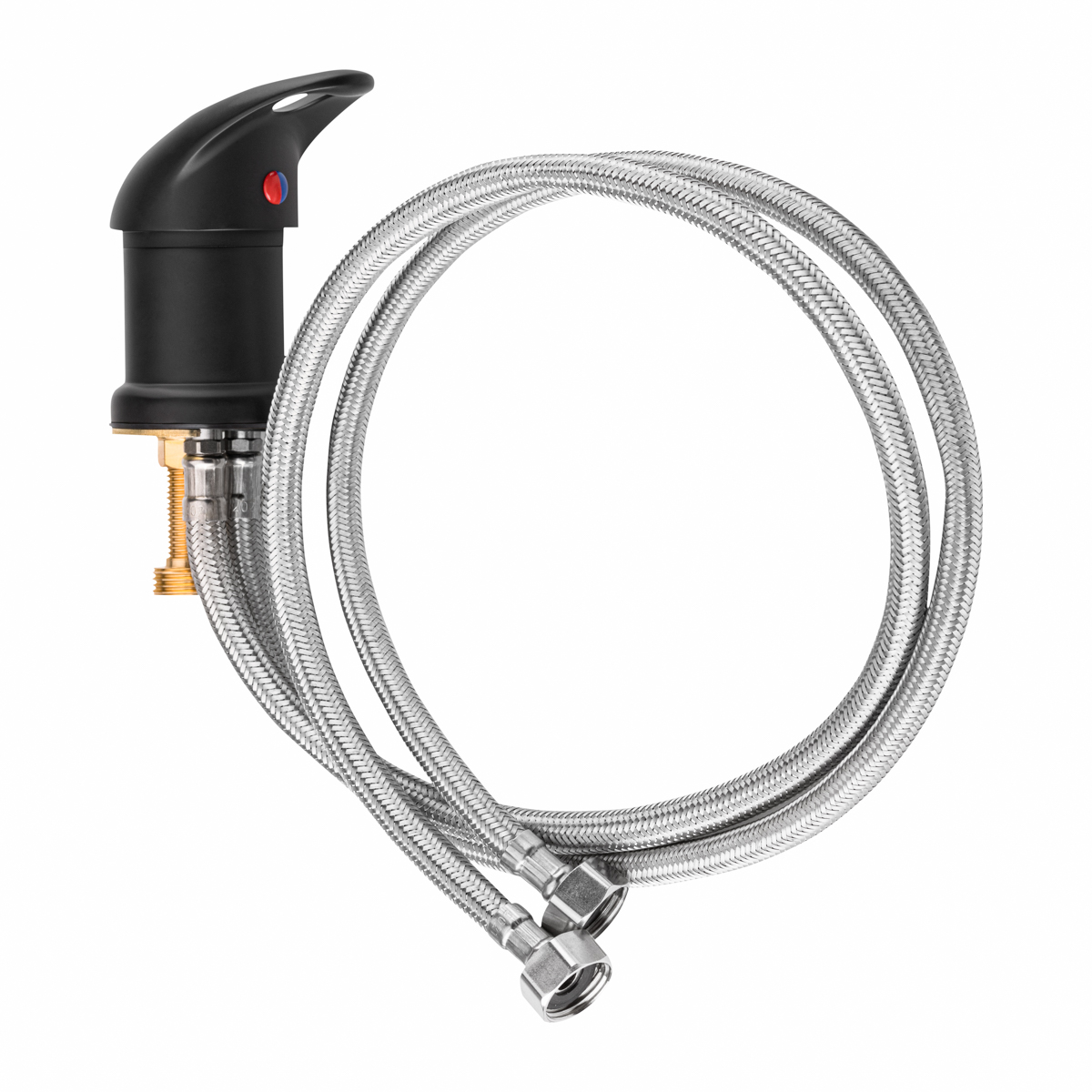 Mixer -batterij die geschikt is voor de meeste kappersspoelen beschikbaar in Nederland. Brass kraan, Zwart afwerking ontmoette hoge weerstand. Verbindingsslangen beveiligd ontmoette een stalen vlecht, die duurzaamheid garandeert. De batterij is compleet en klaar voor installatie in een wasunit.